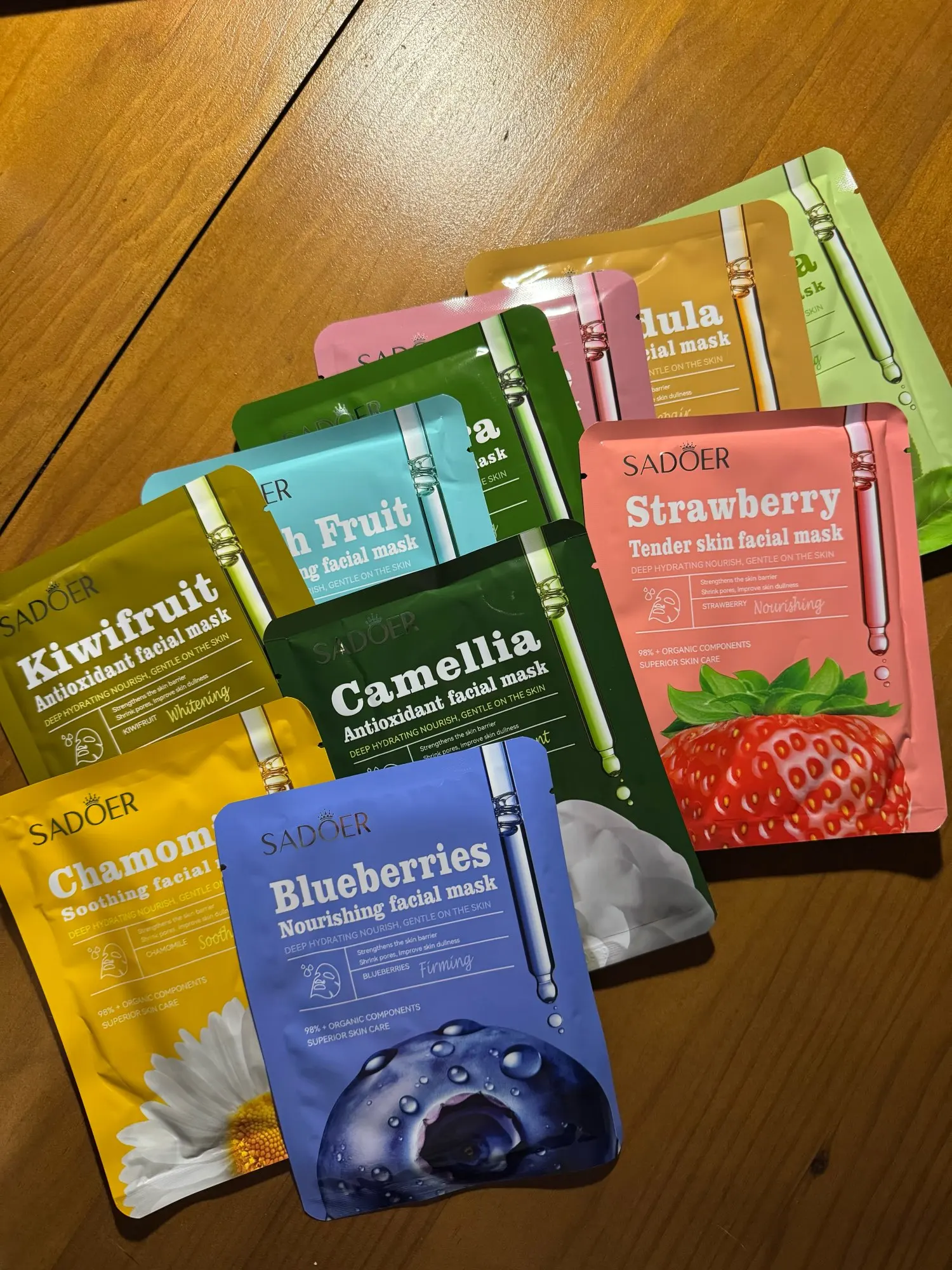 Lot 10pcs Masques Visage SADOER Fruits Floraux - Hydratant Raffermissant Camomille Myrtille Soin Peau Beauté