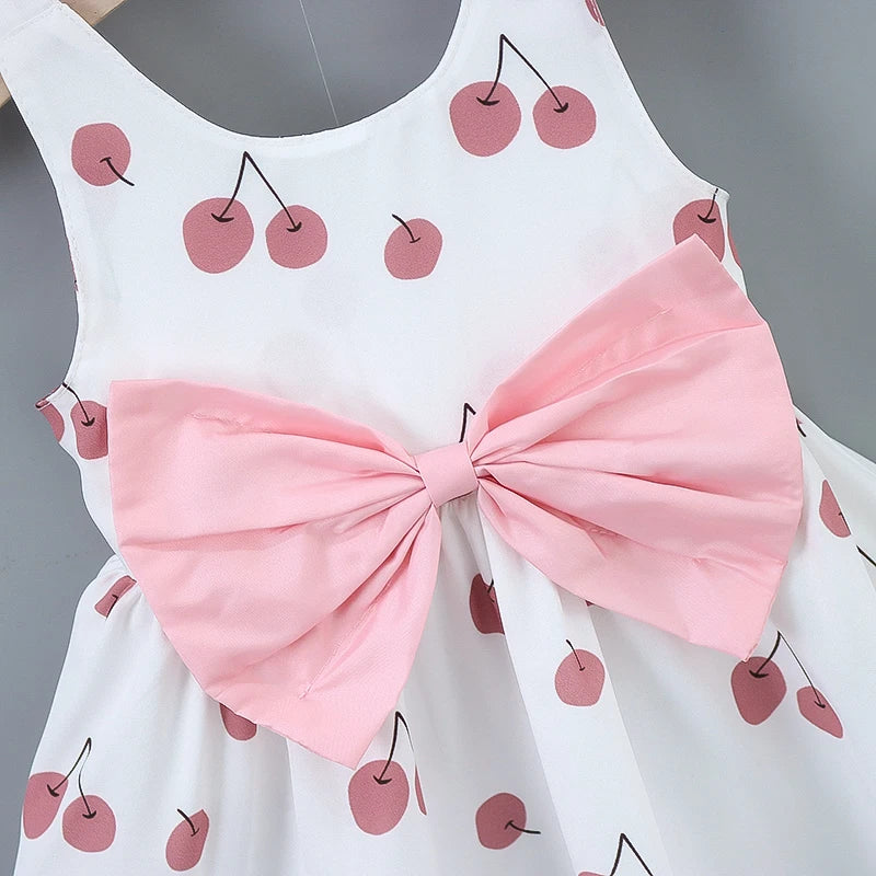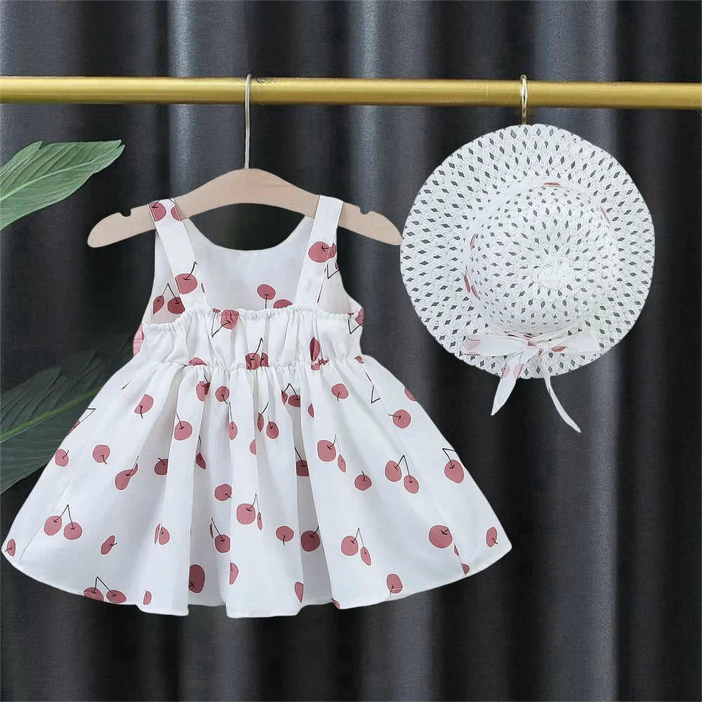 Lot 2 Robes Fille Été Cerises - Robes Sans Manches Imprimé Fruits + Chapeau
