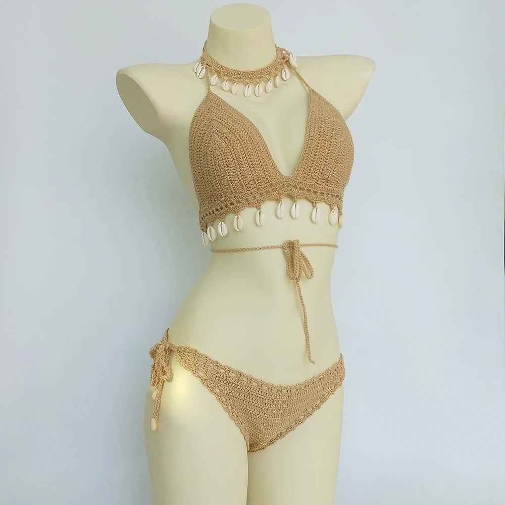 Adoptez un look bohème chic avec cet ensemble bikini 3 pièces orné de coquillages et de détails crochet artisanaux.