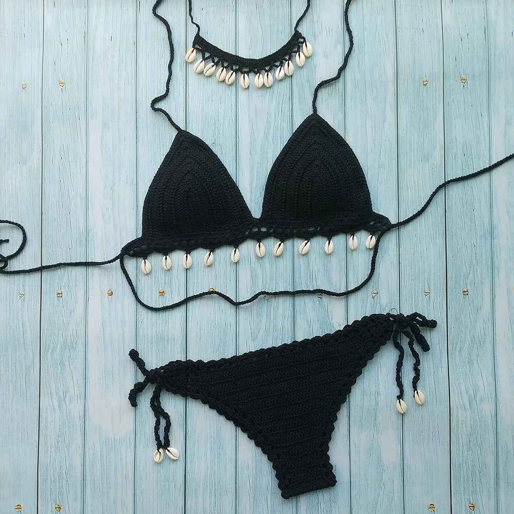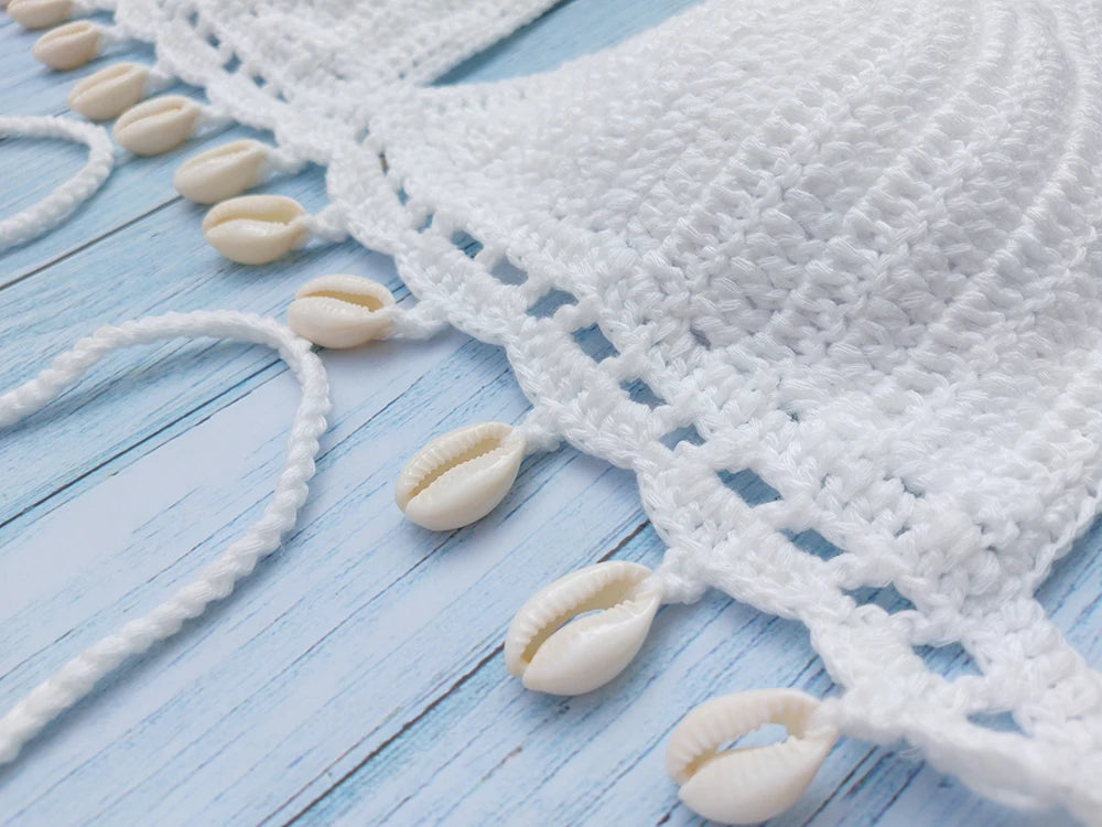 - Set complet 3 pièces : Top crochet avec coquillages et franges, string sexy taille basse ajouré et chaîne de cheville coquillage assortie