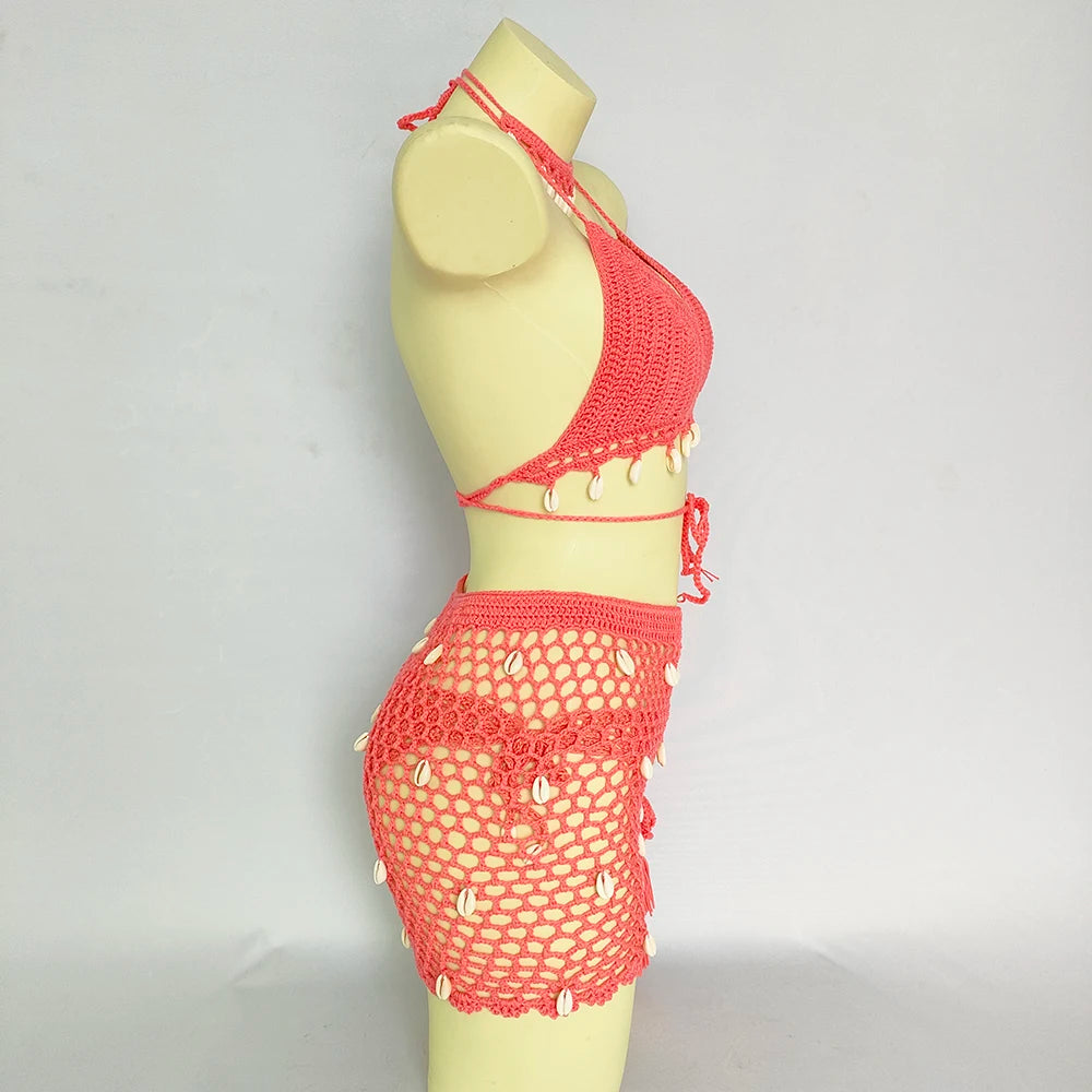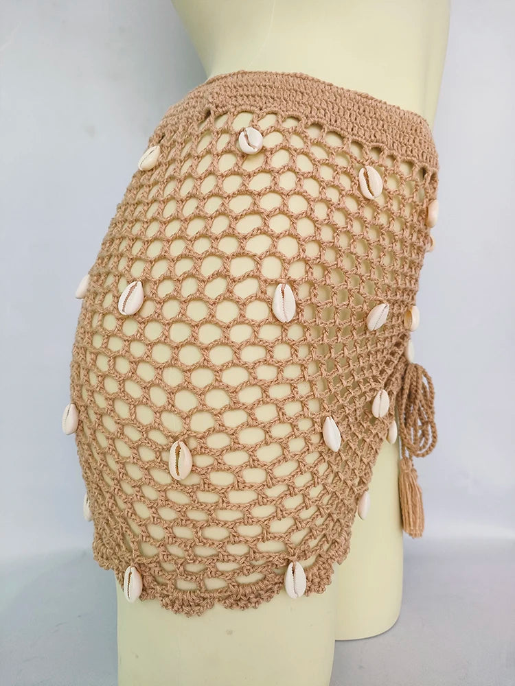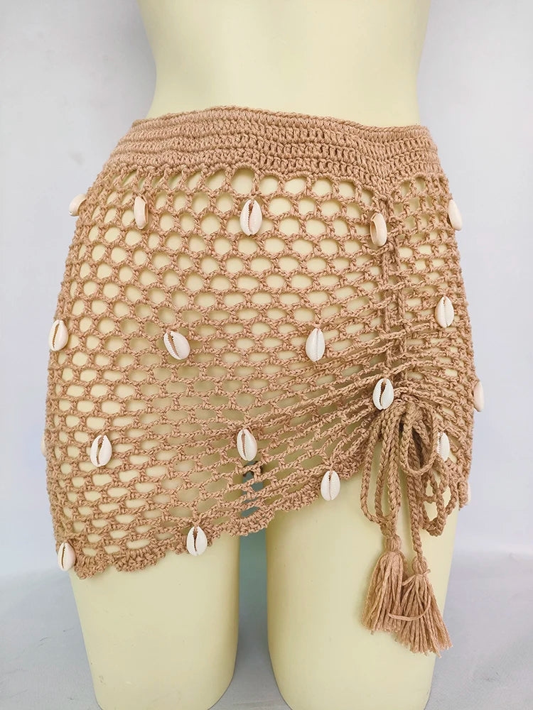 - Set complet 4 pièces : Top crochet avec coquillages et franges, string sexy, short taille haute bandage et jupe de plage ajourée