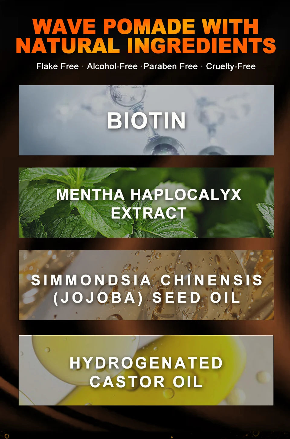 Mode d'emploi : Prélevez une petite quantité de pommade et réchauffez-la entre vos mains. Appliquez sur cheveux humides ou secs en massant bien le cuir chevelu pour stimuler la croissance. Coiffez pour créer vos 360 waves ou votre style désiré. Utilisez sur les bordures pour un edge control parfait. Utilisez quotidiennement pour des résultats optimaux anti-chute.