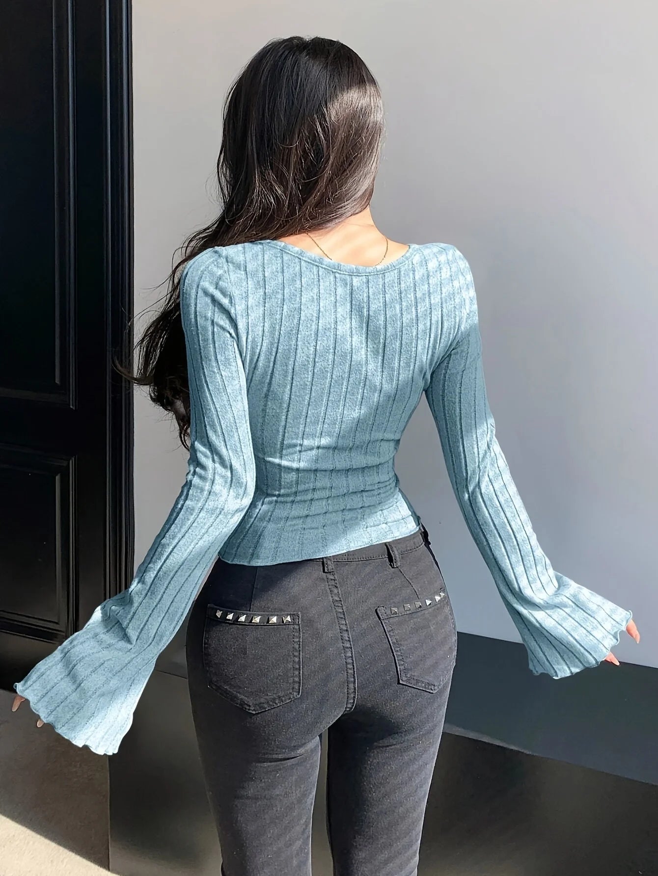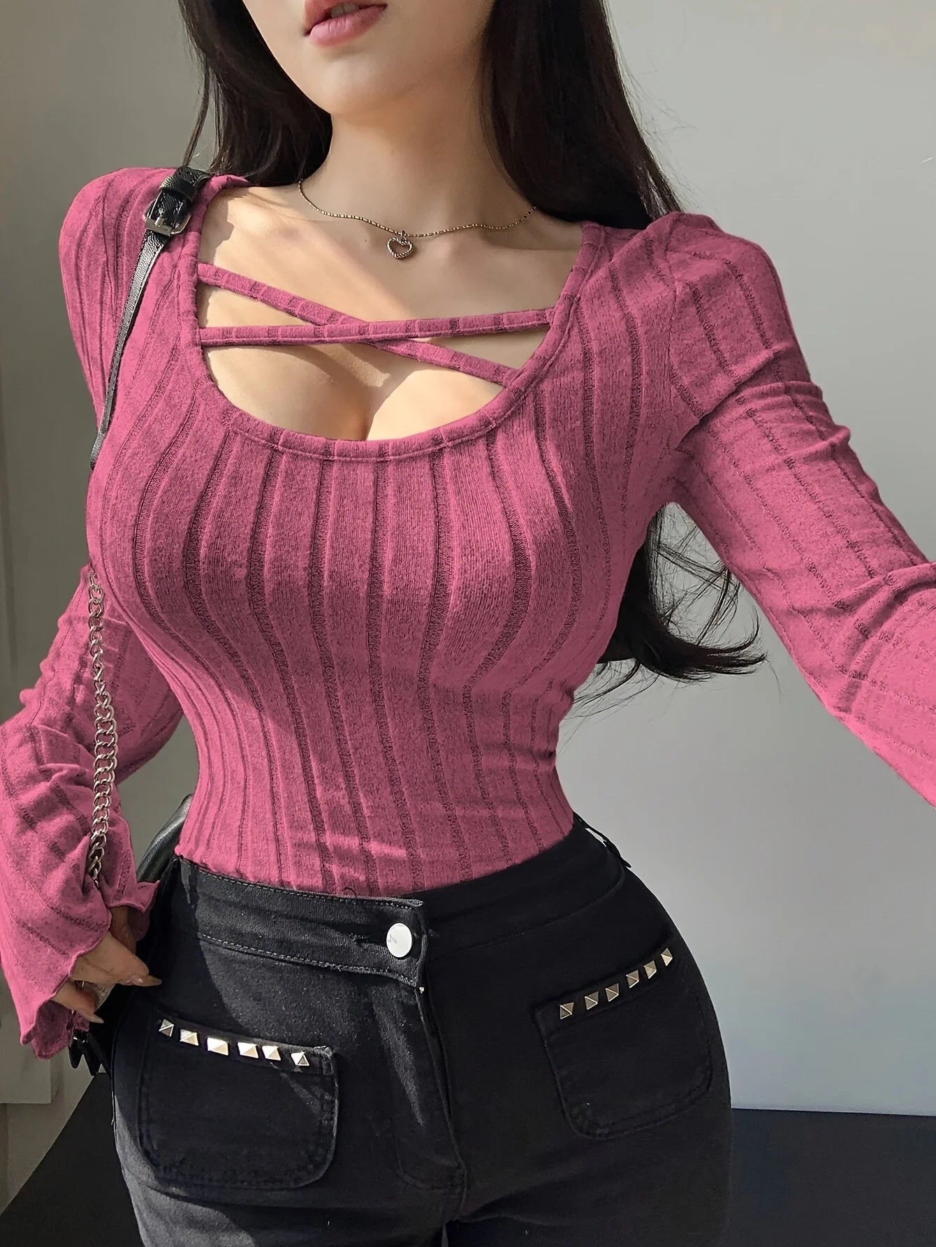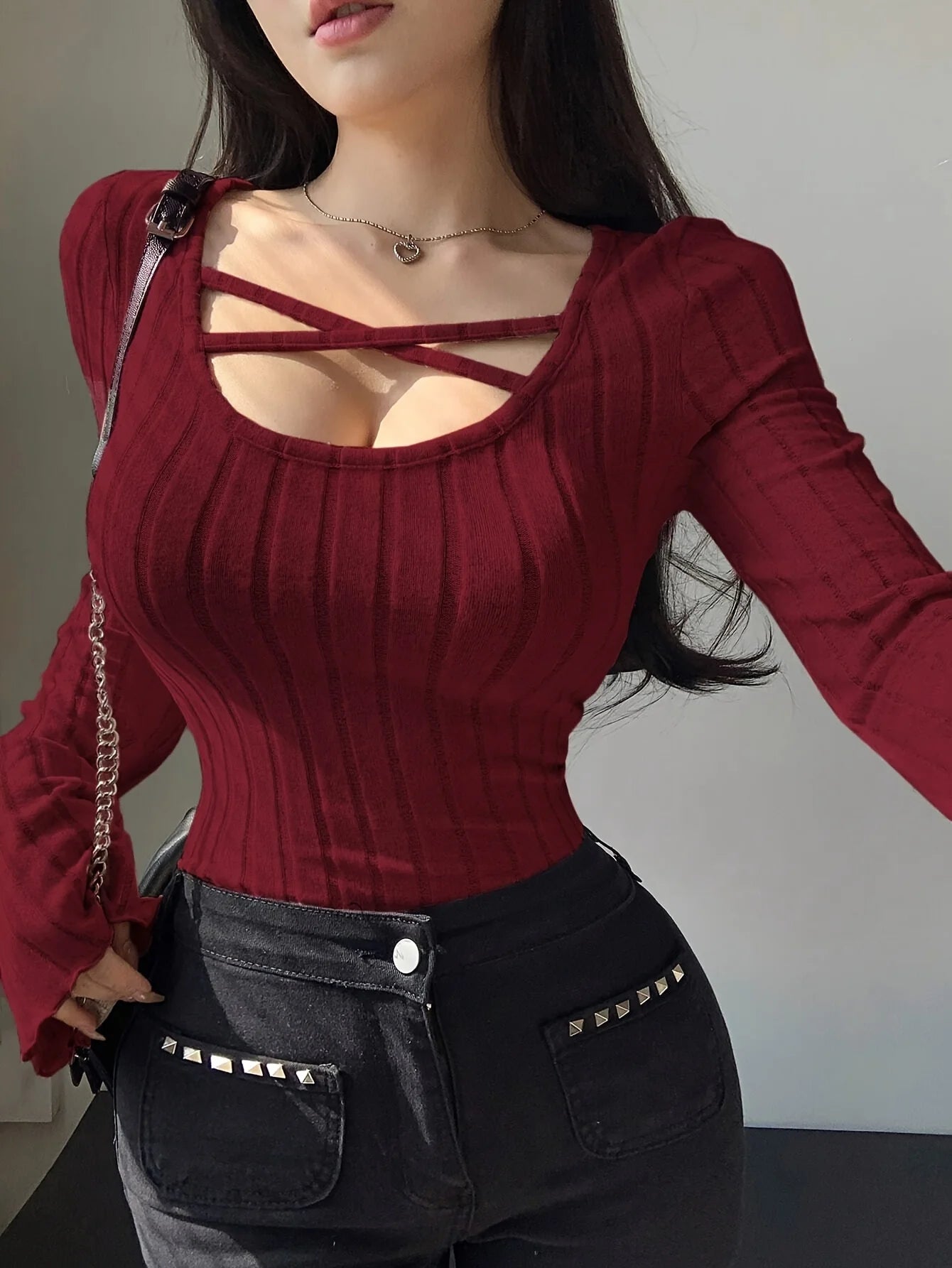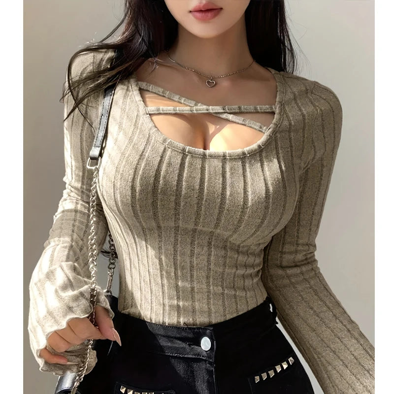 Ce top automne-hiver combine col carré tendance, bretelles croisées et côtes slim fit. Style casual streetwear pour le quotidien.