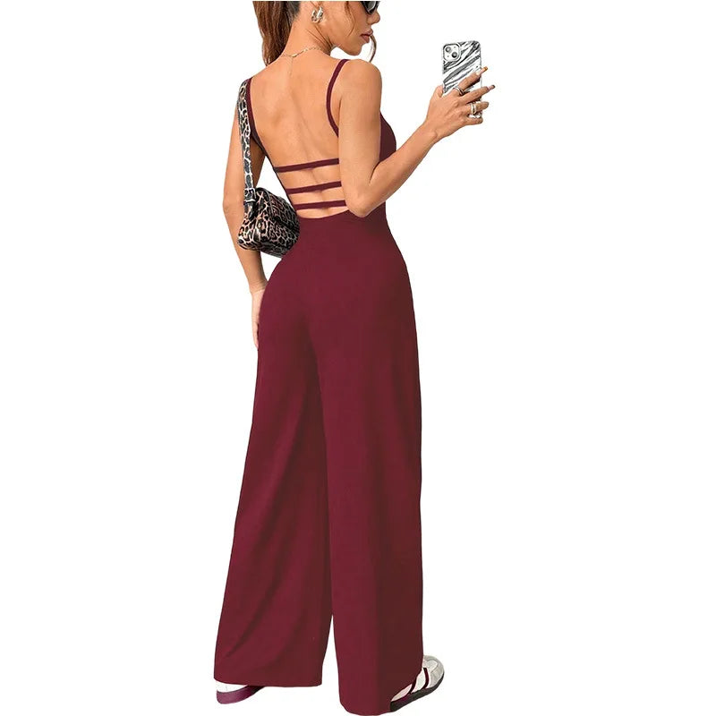 Découvrez cette combinaison femme casual bretelles dos nu couleur unie. Design sans manches loose jambes larges pour un look simple style confortable et élégant parfait pour vos journées décontractées.