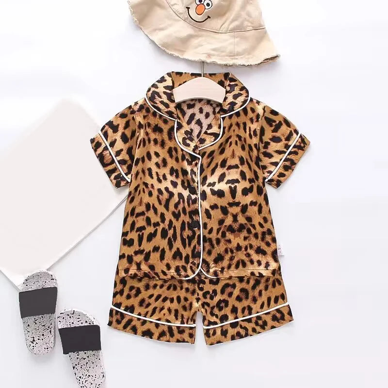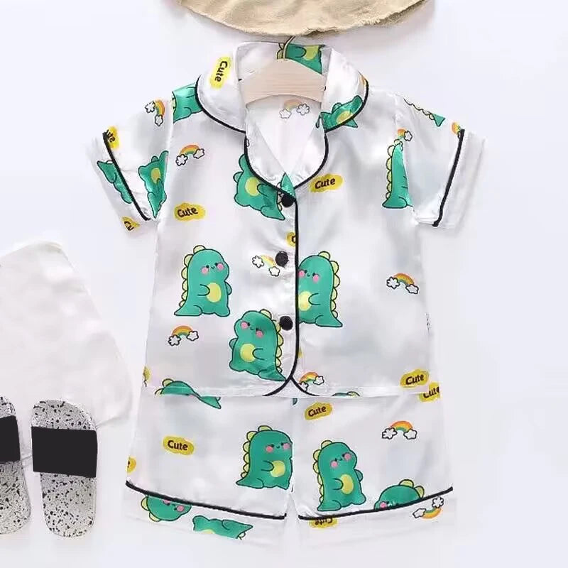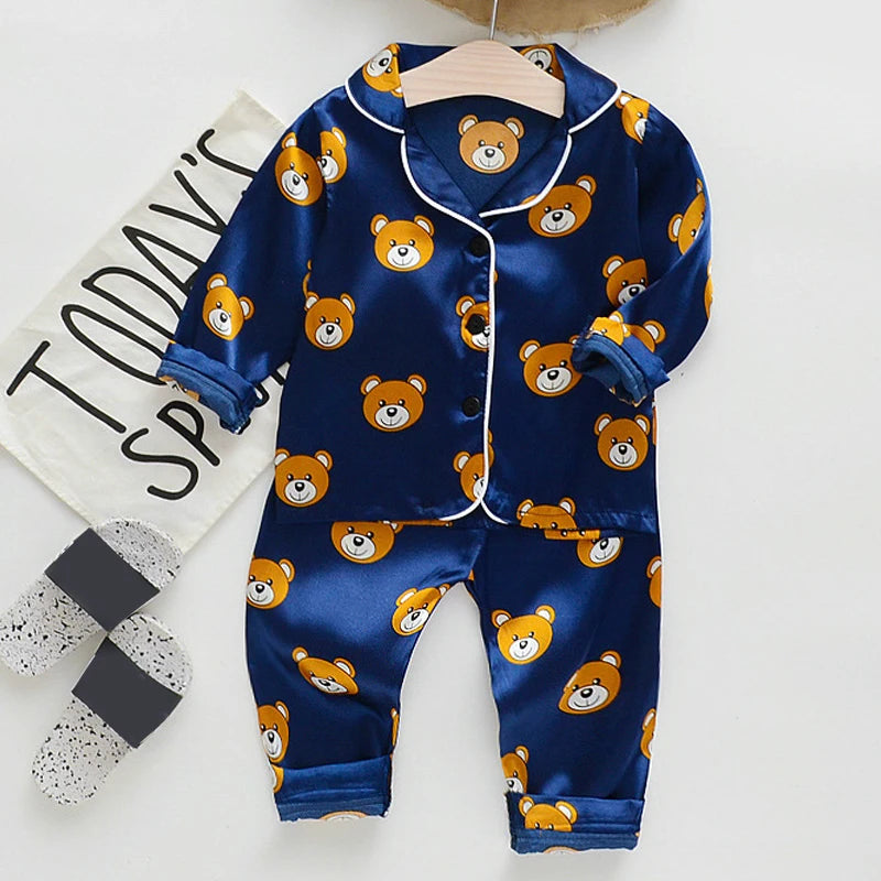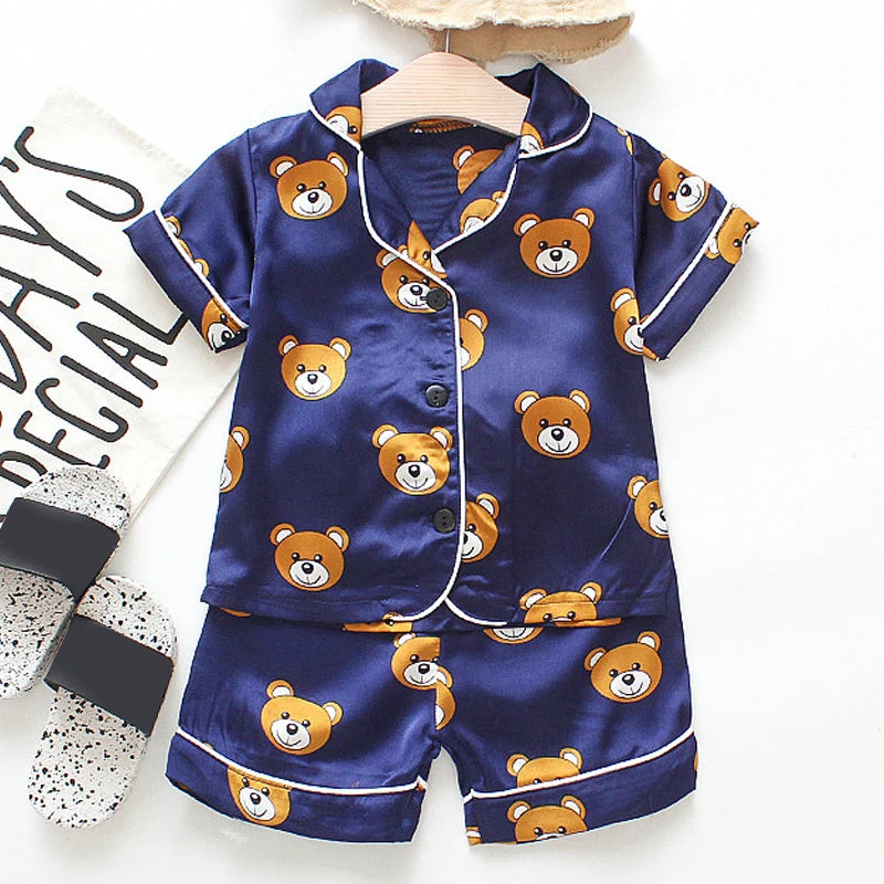 Kids Cartoon Bear Pajama Set - Ice Silk Satin Summer Sleepwear