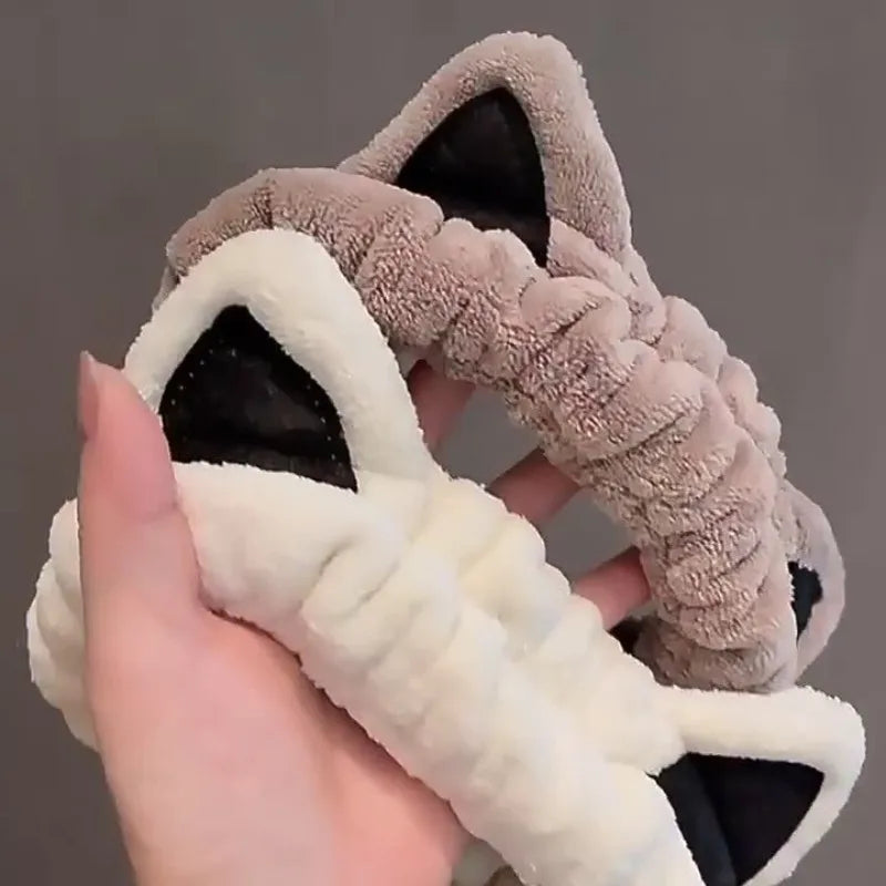 Adorable bandeau cheveux en forme de chat en peluche douce, parfait pour maintenir vos cheveux pendant le lavage du visage, le maquillage ou votre routine beauté quotidienne.