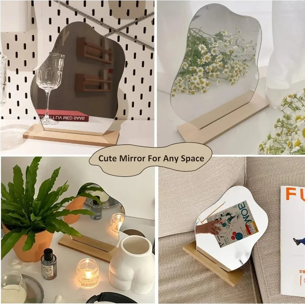 Miroir Décoratif Acrylique Base Bois - Minimaliste Irrégulier Maquillage Chambre Coiffeuse Beauté Cosmétiques
