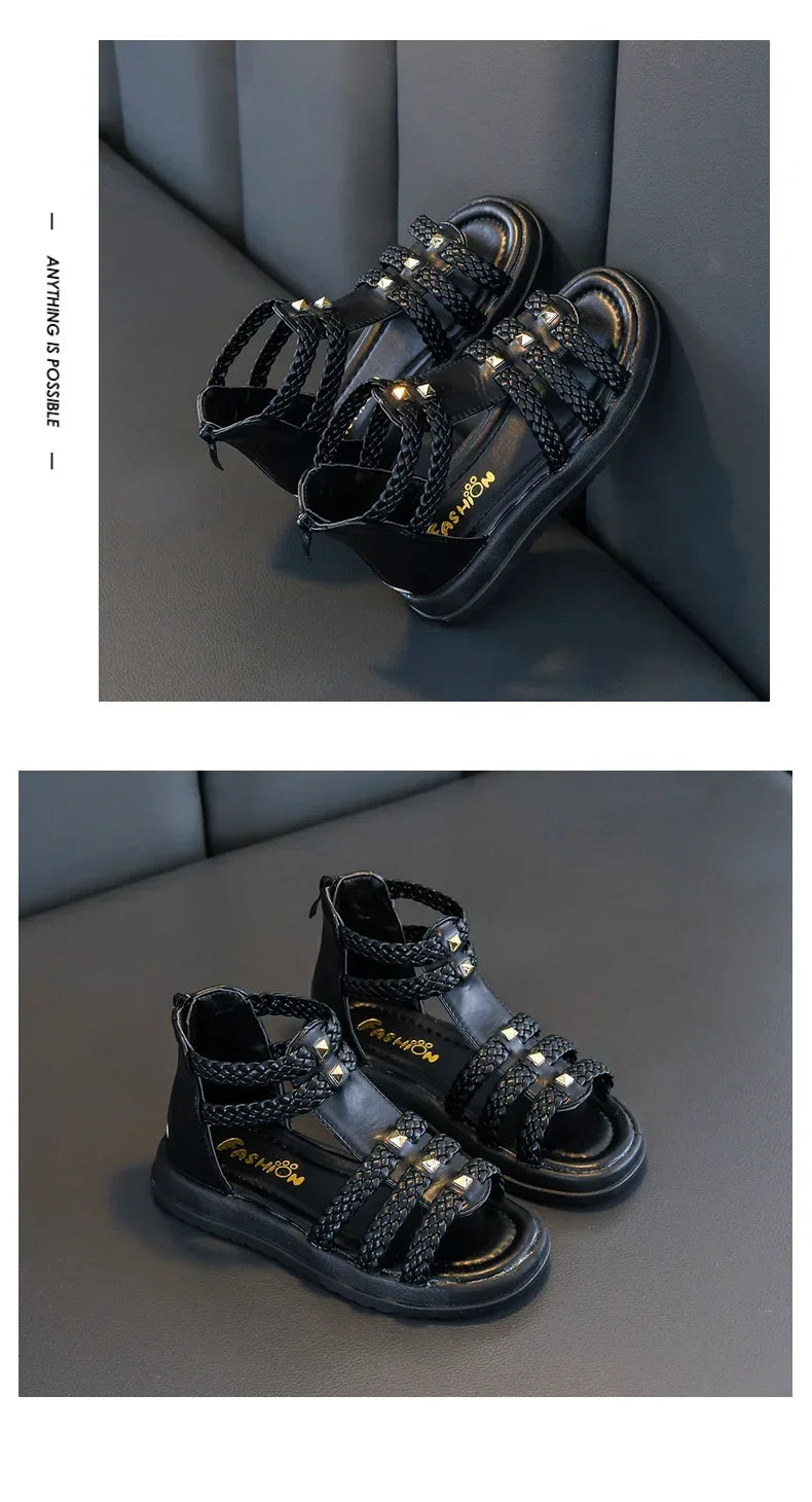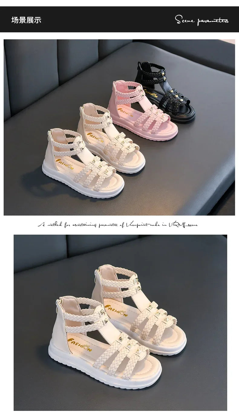 Découvrez ces sandales romaines tressées pour filles ! Ces chaussures plates montantes allient design tressé élégant, détails rivets tendance et style casual sophistiqué. Parfaites pour l'été, les sorties décontractées, l'école ou le quotidien avec une touche de mode.