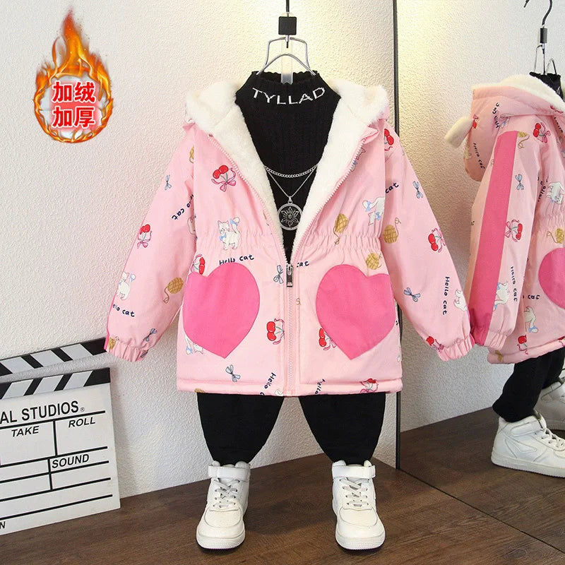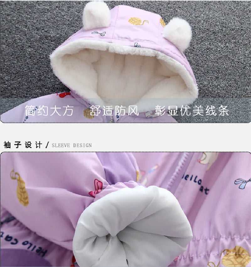 Protégez votre fille du froid avec cette veste d'hiver ultra-chaude et adorable. Dotée d'une doublure en polaire épaisse, d'une capuche protectrice et d'imprimés cartoon amusants, ce manteau rembourré allie chaleur maximale, confort et style pour les enfants actifs pendant l'hiver.