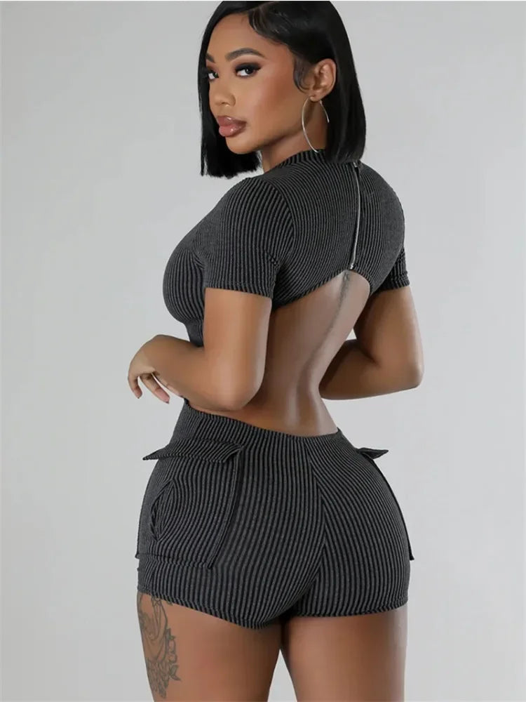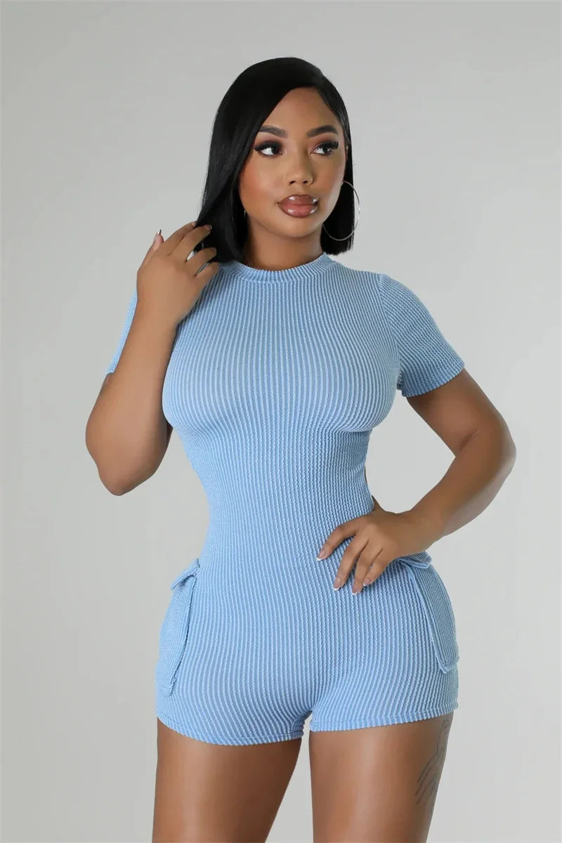 Combinaison Femme Tricot Côtelé Été - Playsuit Manches Courtes Dos Ouvert Poches Moulante