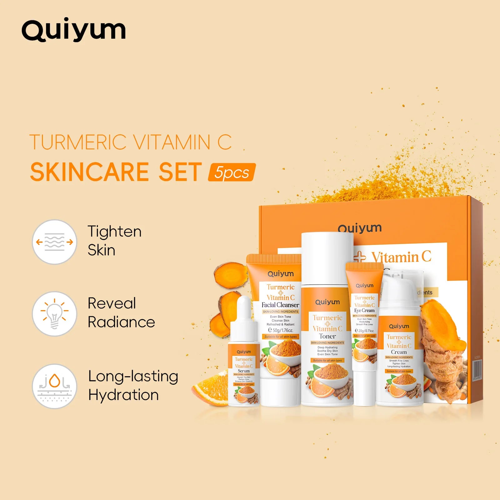 Kit Soin Visage Curcuma LAIKOU 5 Pièces - Nettoyant Tonique Sérum Crème Yeux Hydratant Anti-Âge