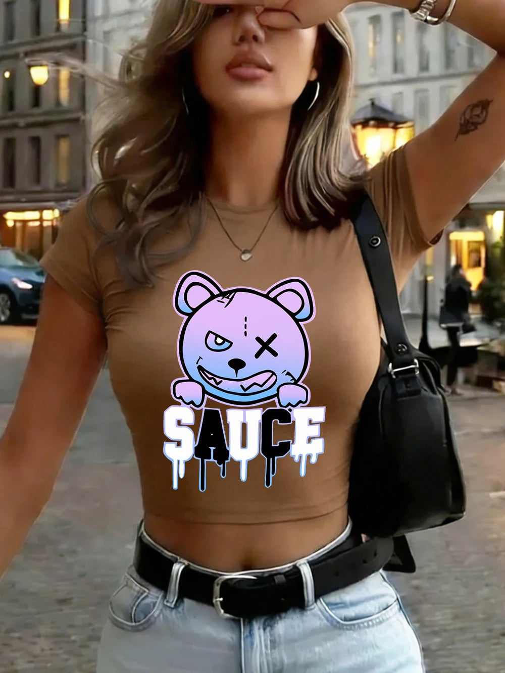 Ce t-shirt crop top combine style coloré et confort absolu. Le design melted bear apporte une touche artistique et vibrante tandis que le tissu élastique procure une sensation douce.