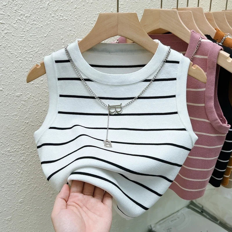 Débardeur Femme Rayé Sans Manches - Top Court Tricot Été Tempérament Élégant