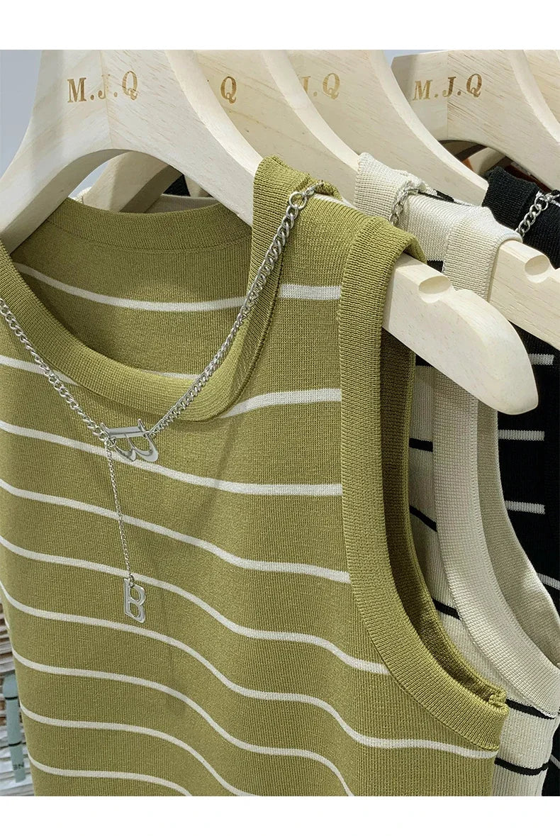 Adoptez un style élégant avec ce débardeur femme rayé sans manches, parfait pour l'été. Design tricot court avec bordure large et tempérament chic.