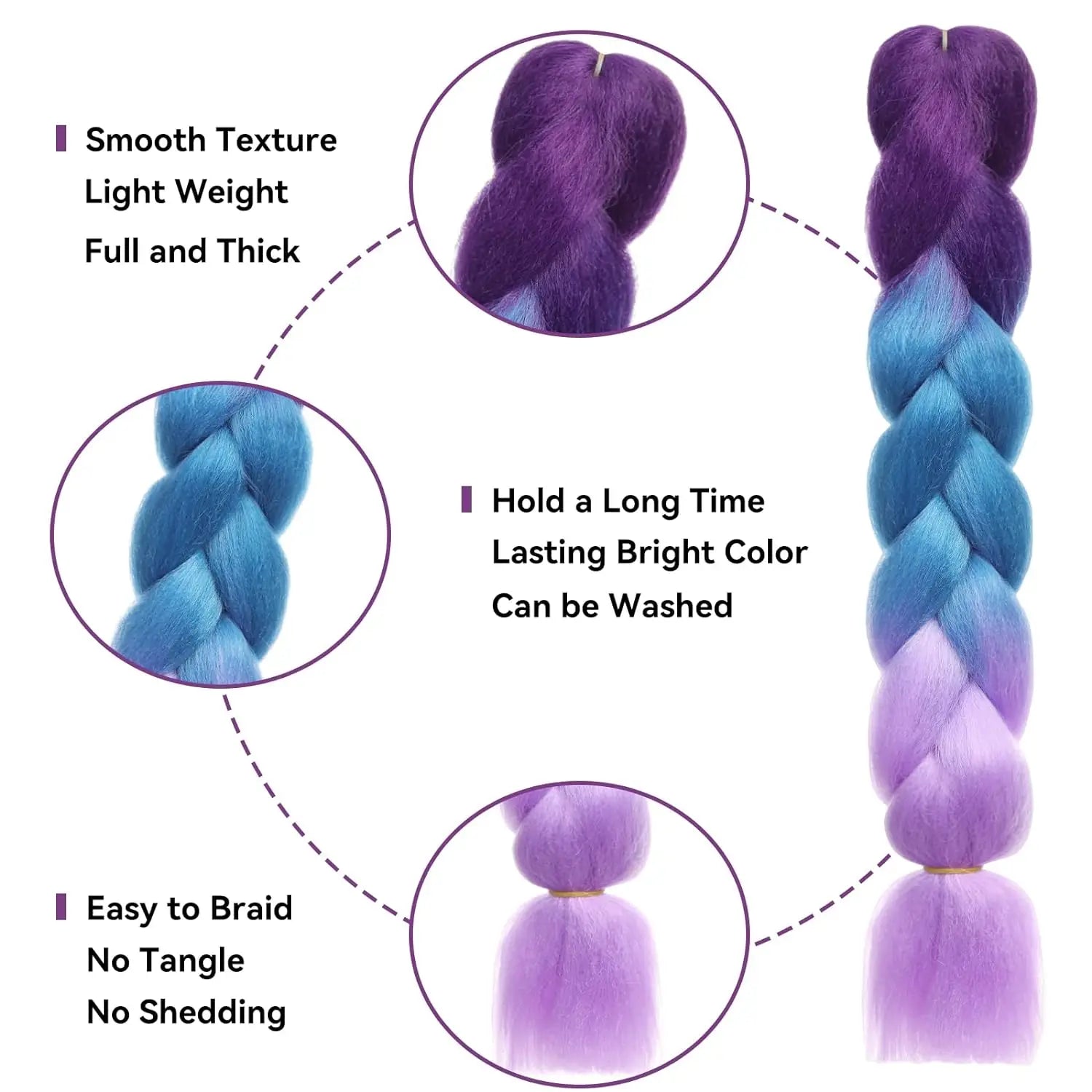 Ce paquet de mèches synthétiques pré-étirées de 24 pouces (environ 60 cm) offre un magnifique dégradé ombré violet, bleu lac et violet clair. Parfaites pour créer des box braids colorées et des coiffures twist audacieuses et tendance.