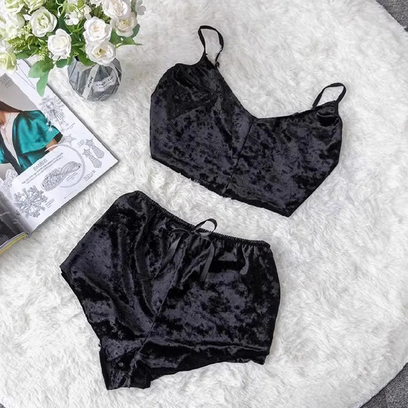 Découvrez cet ensemble pyjama velours col V bretelles 2 pièces. Débardeur + short sexy loungewear pour un look homewear luxueux et sensuel parfait pour vos nuits et moments détente à la maison.