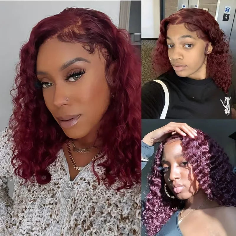 Perruque Bob Courte Water Wave Bordeaux 99J - Cheveux Naturels Remy avec Lace Frontal 13x4