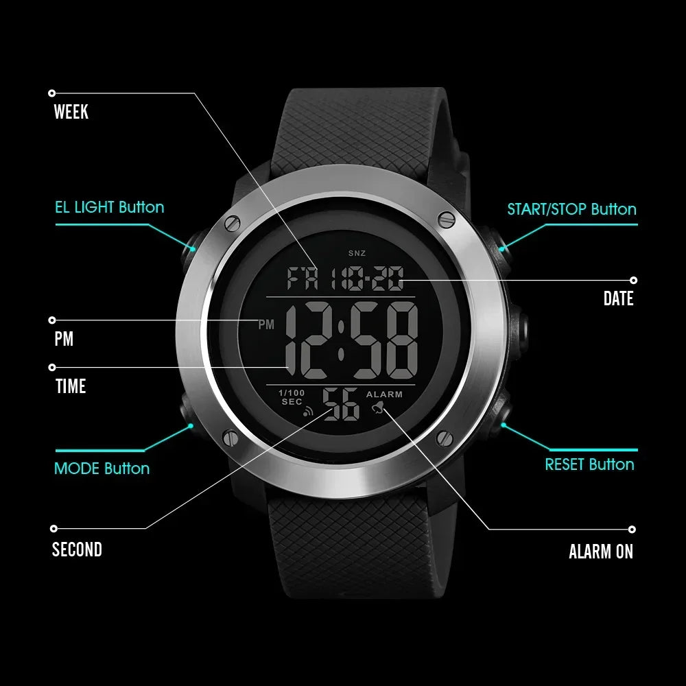 Que vous nagiez, couriez sous la pluie ou simplement viviez une vie active, cette montre SKMEI vous suit partout. Son étanchéité 5Bar vous permet de plonger sans souci pendant que son alarme vous garde ponctuel. C'est la montre qui s'adapte à votre rythme de vie intense.