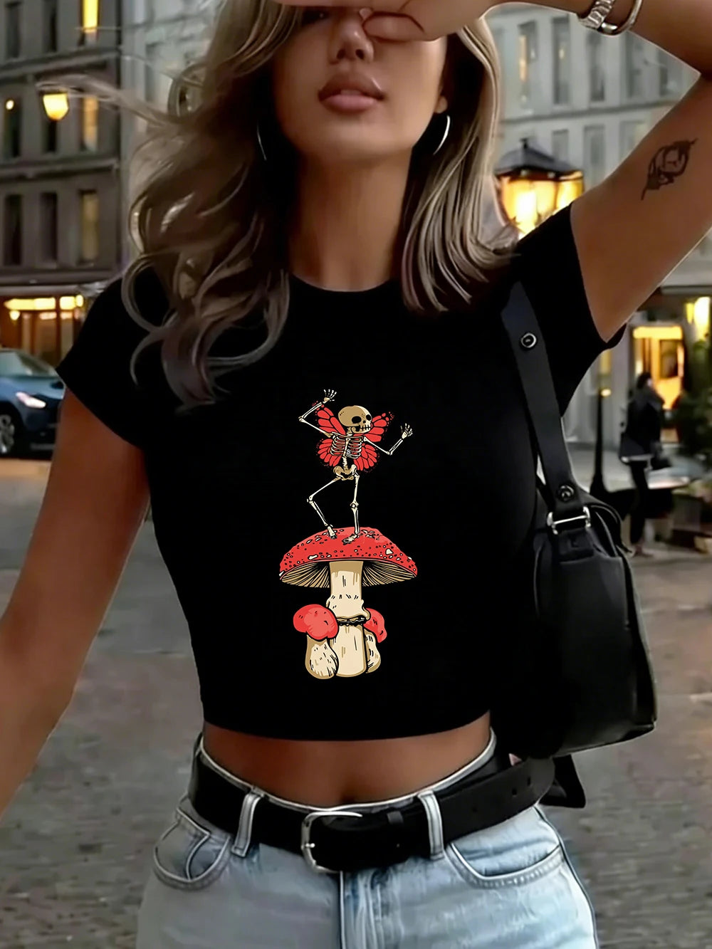 Top Crop Femme Skull Wings Mushroom - Design Gothic Mystique