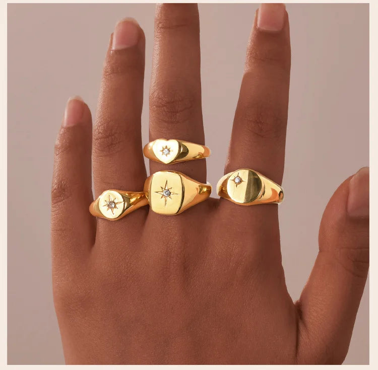Rayonnez avec cette bague chevalière soleil acier plaqué or avec zircone cubique, un bijou élégant et lumineux.