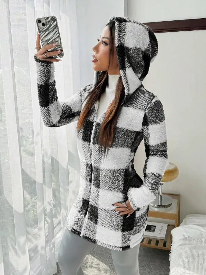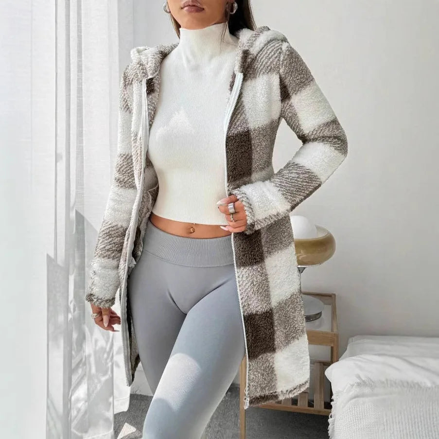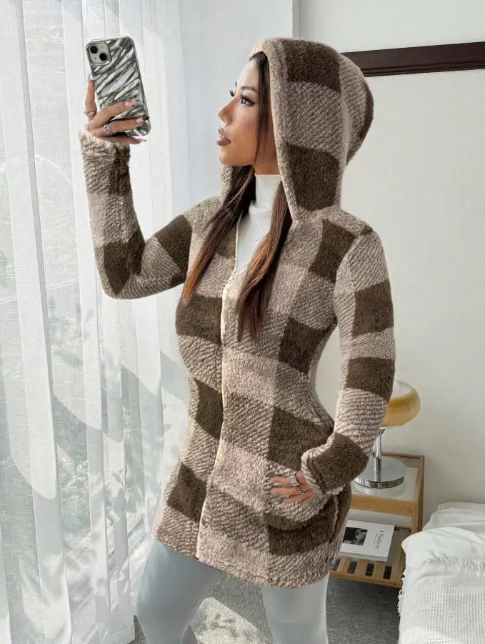 Manteau long d'hiver douillet en peluche avec motif carreaux tendance. Capuche confortable et poches pratiques pour affronter le froid avec style.