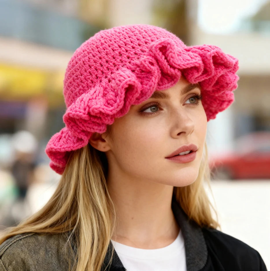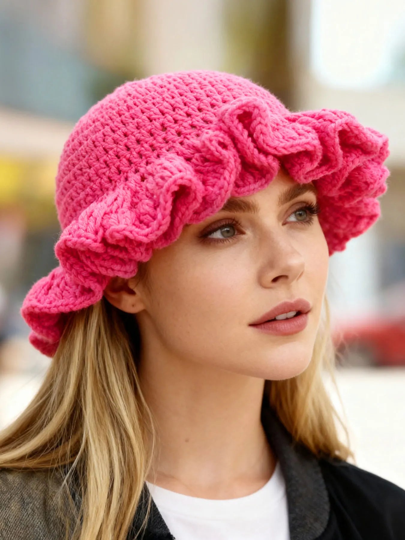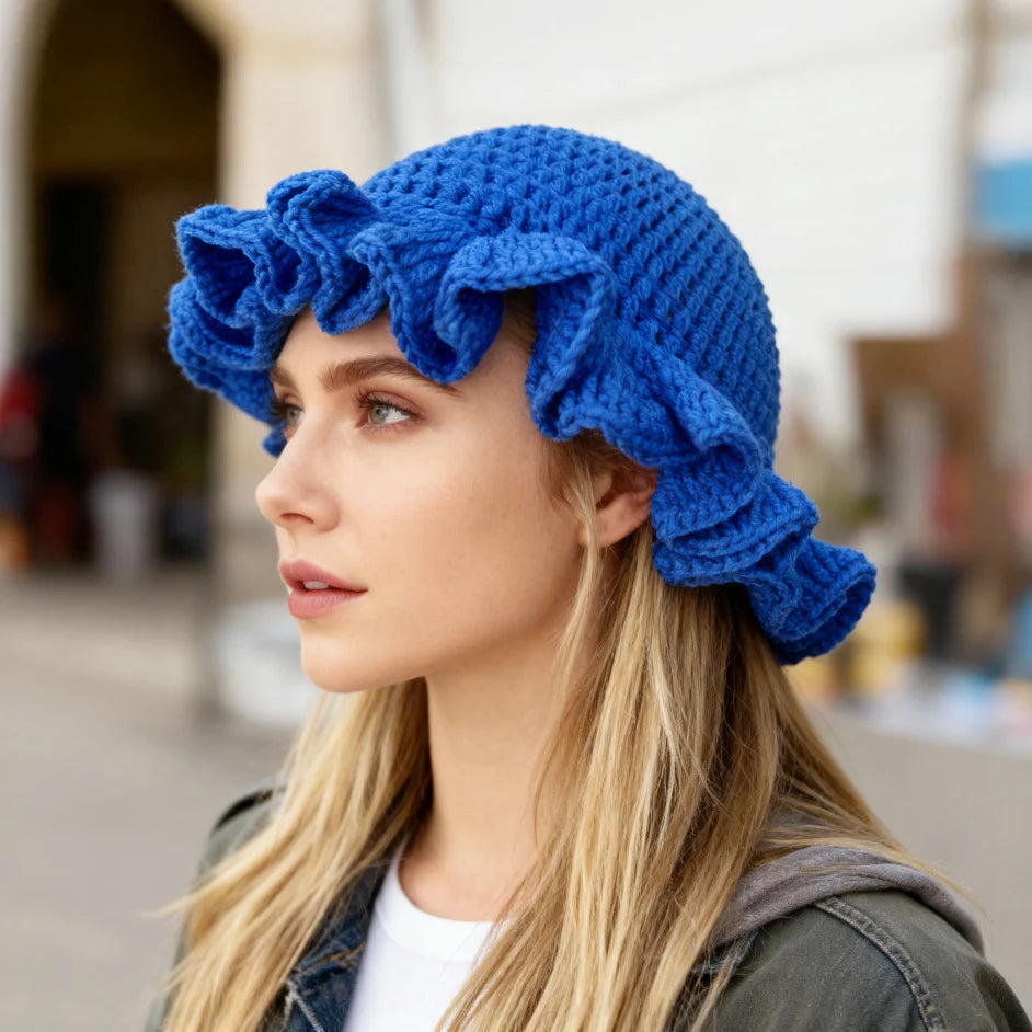 Chapeau Bob Tricoté Moelleux Femme - Bonnet Crochet Ajouré avec Volants Style Pêcheur pour Automne Hiver