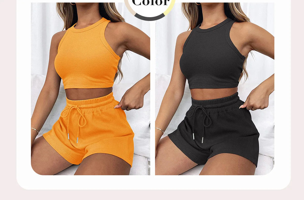 Ensemble Short Texturé Gaufré Femme - Crop Tank Top + Short Cordon 2 Pièces