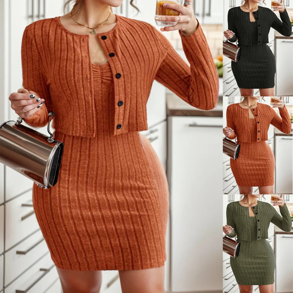 Cet ensemble combine parfaitement élégance et confort pour un look professionnel raffiné. La robe à bretelles en tricot offre une base féminine et moderne tandis que la veste cardigan boutonnée apporte une touche sophistiquée et professionnelle. Portez ensemble pour un look complet ou séparément pour plus de polyvalence.