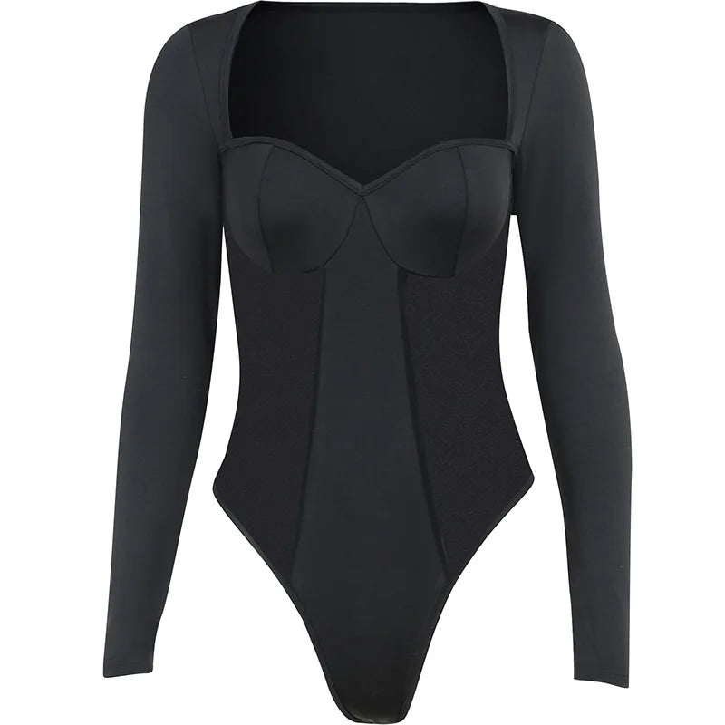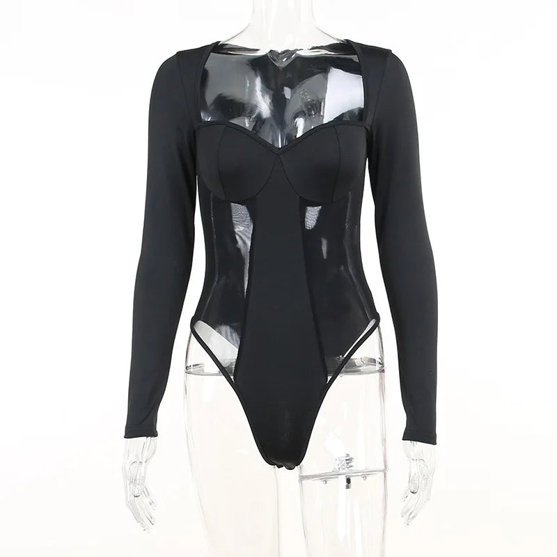 Ce bodysuit combine sensualité et style Y2K. Le design corset transparent apporte une touche audacieuse tandis que les manches longues ajoutent une sophistication.