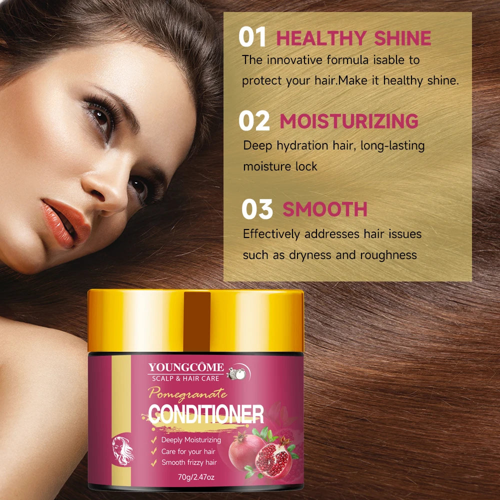 Adoptez l'après-shampooing aloé grenade YOUNGCOME pour des cheveux réparés, nourris, lisses et brillants sans frisottis.